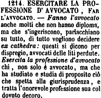 | Esercitare la professione d’avvocato, Far l’avvocato - Fanno l'avvocato anche molti che non hanno diploma, ma che s'ingeriscono, parlacchiano su tutto, di tutto vogliono decidere ex cathedra: questi di dicono per dispregio, avvocati delle liti perdute. Esercita la professione dell'avvocato chi, non solo è avvocato, ma che ha studiato e studia di proposito ciò che spetta alla giurisprudenza, e tratta l'onorevole professione sua col dovuto decoro. [immagine] |