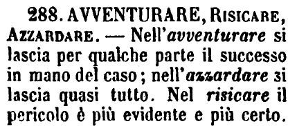 | Avventurare, Risicare, Azzardare - Nell'avventurare si lascia per qualche parte il successo in mano del caso; nell'azzardare si lascia quasi tutto. Nel risicare il pericolo è più evidente e più certo. [immagine] |