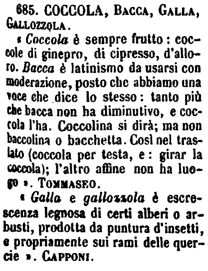 | Coccola, Bacca, Galla, Gallozzola - « Coccola è sempre frutto: coccole di ginepro, di cipresso, d'alloro. Bacca è latinismo da usarsi con moderazione, posto che abbiamo una voce che dice lo stesso: tanto più che bacca non ha diminutivo, e coccola l'ha. Coccolina si dirà; ma non baccolina o bacchetta. Così nel traslato (coccola per testa, e: girar la coccola); l'altro affine non ha luogo ». Tommaseo.