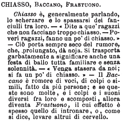 Chiasso, Baccano, Frastuono - Chiasso è, generalmente parlando, lo scherzare e lo spassarsi dei fanciulli tra loro. - « Dite a que' ragazzi che non facciano troppo chiasso. - Poveri ragazzi, fanno un po' di chiasso.» - Ciò porta sempre seco del rumore, che, prolungato, dà noja. Si trasporta garbatamente a significare anche una festa di ballo tutta familiare e senza solennità. - « Venga stasera da noi; si fa un po' di chiasso.» - Il Baccano è romore di voci, di colpi o simili, fatto da più persone; e se queste sono molte, e i colpi e i suoni diversi fra loro e scomposti, allora diventa Frastuono , il cui effetto è spesso quello di intronare, o, come si dice, levare altrui di cervello. [immagine]