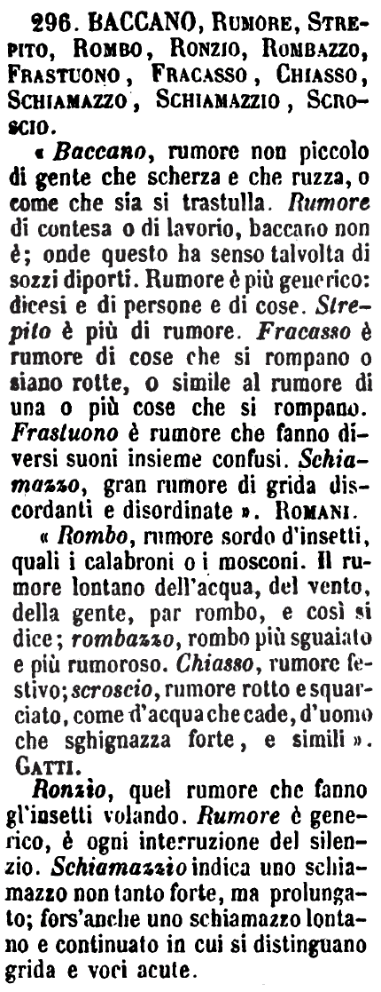 Baccano, Rumore, Strepito, Rombo, Ronzio, Rombazzo, Frastuono, Fracasso, Chiasso, Schiamazzo, Schiamazzio, Scroscio - «Baccano, rumore non piccolo di gente che scherza e che ruzza, o come che sia si trastulla. Rumore di contesa o di lavorio, baccano non è; onde questo ha senso talvolta di sozzi diporti. Rumore è più generico: dicesi e di persone e di cose. Strepito è più di rumore. Fracasso è rumore di cose che si rompano o siano rotte, o simile al rumore di una o più cose che si rompano. Frastuono è rumore che fanno diversi suoni insieme confusi. Schiamazzo, gran rumore di grida discordanti e disordinate». Romani.
