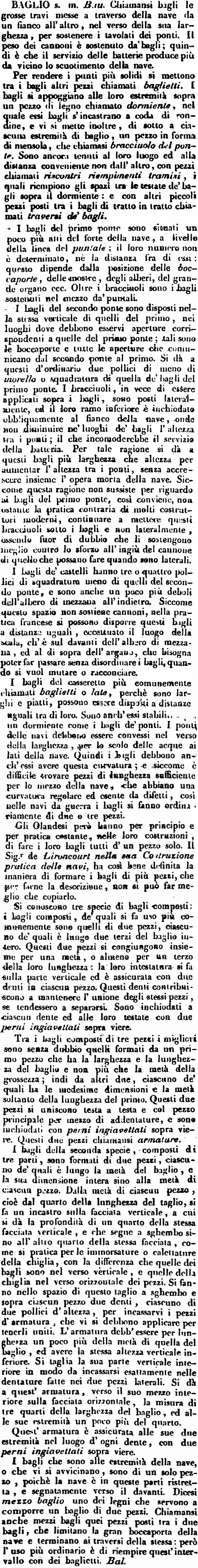 | Baglio - s. m. Bau. Chiamansi bagli le grosse travi messe a traverso della nave da un fianco all'altro, nel verso della sua larghezza, per sostenere i tavolati dei ponti. Il peso dei cannoni è sostenuto da' bagli; quindi è che il servizio delle batterie produce più da vicino lo scuotimento della nave.