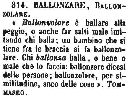 | Ballonzare, Ballonzolare - « Ballonzolare è ballare alla peggio, o anche far salti male imitando chi balla; un bambino che si tiene fra le braccia si fa ballonzolare. Chi ballonza balla, o bene o male che lo faccia: ballonzare dicesi delle persone; ballonzolare, per similitudine, anco delle cose ». Tommaseo. [immagine] |
