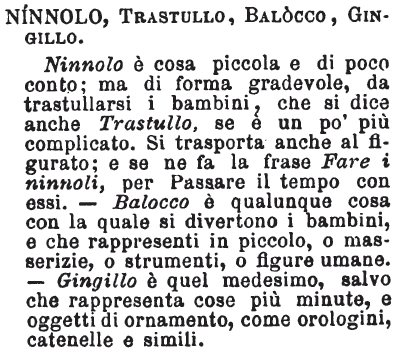 Ninnolo, Trastullo, Balocco, Gingillo - Ninnolo è cosa piccola e di poco conto; ma di forma gradevole, da trastullarsi i bambini, che si dice anche Trastullo, se è un po' più complicato. Si trasporta anche al figurato; e se ne fa la frase Fare i ninnoli, per Passare il tempo con essi. - Balocco è qualunque cosa con la quale si divertono i bambini, e che rappresenti in piccolo, o masserizie, o strumenti, o figure umane. - Gingillo è quel medesimo, salvo che rappresenta cose più minute, e oggetti di ornamento, come orologini, catenelle e simili. [immagine]