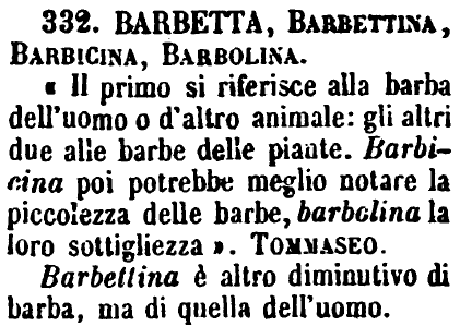 | Barbetta, Barbettina, Barbicina, Barbolina - «Il primo si riferisce alla barba dell'uomo o d'altro animale: gli altri due alle barbe delle piante. Barbicina poi potrebbe meglio notare la piccolezza delle barbe, barbolina la loro sottigliezza». Tommaseo.