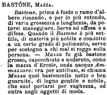 Bacchetta, Mazza, Bastone - Bacchetta, piccola verga di legno o di ferro; può essere rustica e ruvida, o raffazzonata e pulita. Mazza è il bastone da passeggio, ha mille forme ed è di mille materie diverse, come è varia la moda. Bastone è cosa più rustica; è atto a reggere viandanti o poveri vecchi; o vi si dà di mano per bastonare. [immagine]
