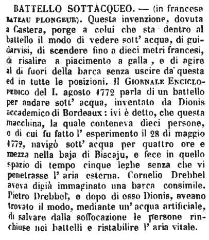 Battello sottacqueo - (in francese bateau plongeur). Questa invenzione, dovuta a Castera, porge a colui che sta dentro al battello il modo di vedere sott'acqua, di guidarvisi, di scendere fino a dieci metri francesi, di risalire a piacimento a galla, e di agire al di fuori della barca senza uscire da questa ed in tutte le posizioni. Il Giornale Enciclopedico del I. agosto 1772 parla di un battello per andare sott'acqua, inventato da Dionis accademico di Bordeaux: ivi è detto, che questa macchina, la quale conteneva dieci persone, e di cui fu fatto l'esperimento il 28 di maggio 1772, navigò sott'acqua per quattro ore e mezza nella baja di Biscaju, e fece in quello spazio di tempo cinque leghe senza che vi penetrasse l'aria esterna. Cornelio Drebbel aveva digià immaginato una barca consimile. Pietro Drebbel, e dopo di esso Dionis, aveano trovato il modo, mediante un'acqua artificiale, di salvare dalla soffocazione le persone rinchiuse nei battelli e ristabilire l'aria vitale. [immagine]