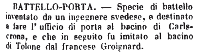 Battello-Porta - Specie di battello inventato da un ingegnere svedese, e destinato a fare l'ufficio di porta al bacino di Carlscrona, e che in seguito fu imitato al bacino di Tolone dal francese Groignard. [immagine]