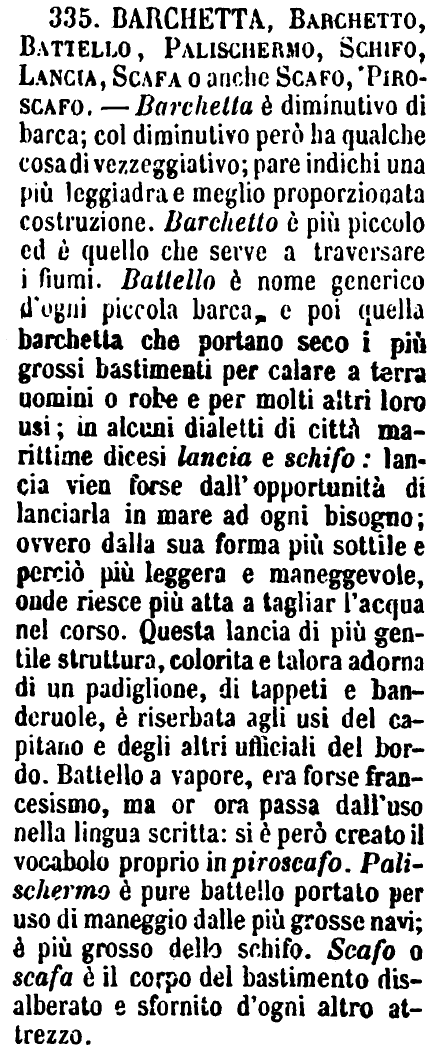 Barchetta, Barchetto, Battello, Palischermo, Schifo, Lancia, Scafa o anche Scafo, Piroscafo - Barchetta è diminutivo di barca; col diminutivo però ha qualche cosa di vezzeggiativo; pare indichi una più leggiadra e meglio proporzionata costruzione. Barchetto è più piccolo ed è quello che serve a traversare i fiumi. Battello è nome generico d'ogni piccola barca, e poi quella barchetta che portano seco i più grossi bastimenti per calare a terra uomini o robe e per molti altri loro usi; in alcuni dialetti di città marittime dicesi lancia e schifo: lancia vien forse dall'opportunità di lanciarla in mare ad ogni bisogno; ovvero dalla sua forma più sottile e perciò più leggera e maneggevole, onde riesce più atta a tagliar l'acqua nel corso. Questa lancia di più gentile struttura, colorita e talora adorna di un padiglione, di tappeti e banderuole, è riserbata agli usi del capitano e degli altri ufficiali del bordo. Battello a vapore, era forse francesismo, ma or ora passa dall'uso nella lingua scritta: si è però creato il vocabolo proprio in piroscafo. Palischermo è pure battello portato per uso di maneggio dalle più grosse navi; è più grosso dello schifo. Scafo o scafa è il corpo del bastimento disalberato e sfornito d'ogni altro attrezzo. [immagine]