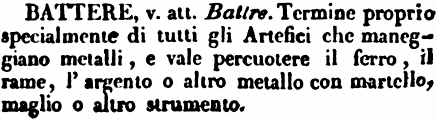 Battere - v. att. Battre. Termine proprio specialmente di tutti gli Artefici che maneggiano metalli, e vale percuotere il ferro, il rame, l'argento o altro metallo con martello, maglio o altro strumento. [immagine]