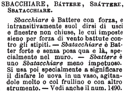 Sbacchiare, Battere, Sbattere, Sbatacchiare - Sbacchiare è Battere con forza, e intransitivamente suol dirsi di usci e finestre non chiuse, le cui imposte sieno per forza di vento battute contro gli stipiti. - Sbatacchiare è Batter forte e senza posa qua e là, specialmente nel muro. - Sbattere è uno Sbatacchiare meno impetuoso. Si usa poi specialmente a significare il disfare le uova in un vaso, agitandole molto o col frullino o con altro strumento. - Vedi anche il num. 1490. [immagine]