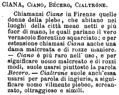 | Ciana, Ciano, Becero, Cialtrone - Chiamansi Ciane in Firenze quelle donne della plebe, che abitano nei luoghi della città meno netti e più fuor di mano, le quali parlano il vero vernacolo fiorentino squarciato; e per estensione chiamarsi Ciana anche una dama malcreata e di rozze maniere. - Ciano è più raro nell'uso, e per significare uomo malcreato e di rozzi modi, suole usarsi piuttosto la parola Becero. - Cialtrone suole anch'esse usarsi per parola di ingiuria, a significare uomo vilmente plebeo, screanzato, oltraggioso e simili. [immagine] |