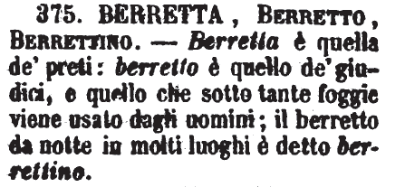 | Berretta, Berretto, Berrettino - Berretta è quella de' preti: berretto è quello de' giudici, e quello che sotto tante foggie viene usato dagli uomini; il berretto da notte in molti luoghi è detto berrettino. [immagine] |