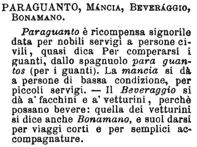 Paraguanto, Mancia, Beveraggio, Bonamano - Paraguanto è ricompensa signorile data per nobili servigi a persone civili, quasi dica Per comperarsi i guanti, dallo spagnuolo para guantos (per i guanti). La mancia si dà a persone di bassa condizione, per piccoli servigi. - Il Beveraggio si dà a' facchini e a' vetturini, perchè possano bevere: quella dei vetturini si dice anche Bonamano, e suol darsi per viaggi corti e per semplici accompagnature. [immagine]
