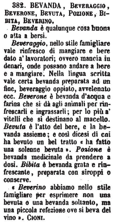 «Beverino abbiamo nello stile famigliare per esprimere non una bevuta o una bevanda soltanto, ma una piccola refezione ove si beva del vino». Cioni. [immagine]