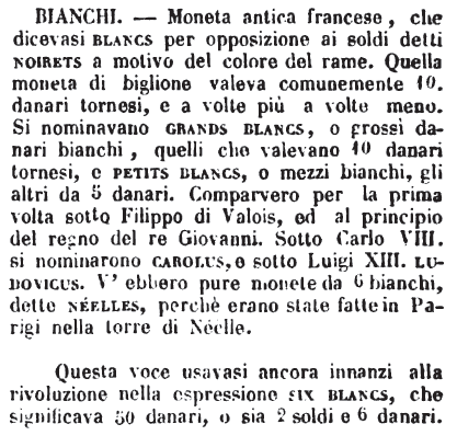 Questa voce usavasi ancora innanzi alla rivoluzione nella espressione six blancs, che significava 50 danari, o sia 2 soldi e 6 danari. [immagine] |