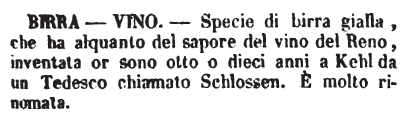 Birra - Vino - Specie di birra gialla, che ha alquanto del sapore del vino del Reno, inventata or sono otto o dieci anni a Kehl da un tedesco chiamato Schlossen. E' molto rinomata. [immagine]