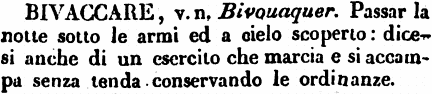 Bivaccare - v. n. Bivouaquer. Passar la notte sotto le armi ed a cielo scoperto: dicesi anche di un esercito che marcia e si accampa senza tenda conservando le ordinanze. [immagine]