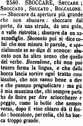 Sboccare, Sbucare; Sboccato, Sbucato, Boccalone - Sboccare da apertura più grande che non sbucare: sboccare dal porto, da una strada, da una gola, o valle ristretta; sbucare da un nascondiglio. Sboccato poi si dice colui che non misura le parole, e specialmente se ne dice di sconce: sbucato non ha altro senso che quello del verbo. Boccalone, chi non può tenere ferma la lingua, e che dalla bocca lascia sortire ogni tratto cose insulse, che non vanno bene a dire e che puonno pregiudicare: ma già è mia massima che, chi sempre parla ha da finire per dire sciocchezze e peggio, come la botte che sempre versa, dopo il vino chiaro dà il fondo: boccalone, per celia, chi ha bocca troppo grande. [immagine]