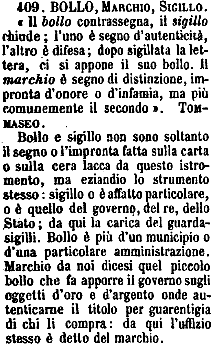 Bollo, Marchio, Sigillo - «Il bollo contrassegna, il sigillo chiude; l'uno è segno d'autenticità, l'altro è difesa; dopo sigillata la lettera, ci si appone il suo bollo. Il marchio è segno di distinzione, impronta d'onore o d'infamia, ma più comunemente il secondo». Tommaseo.