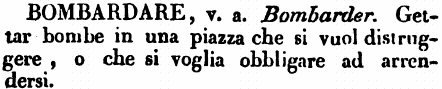 | Bombardare - v. a. Bombarder. Gettar bombe in una piazza che si vuol distruggere, o che si voglia obbligare ad arrendersi. [immagine] |