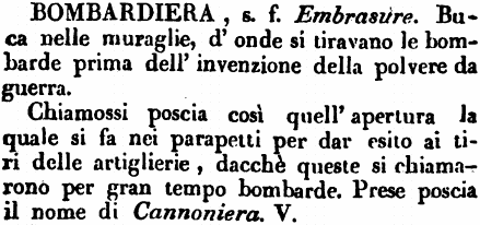 Bombardiera - s. f. Embrasure. Buca nelle muraglie, d'onde si tiravano le bombarde prima dell'invenzione della polvere da guerra.