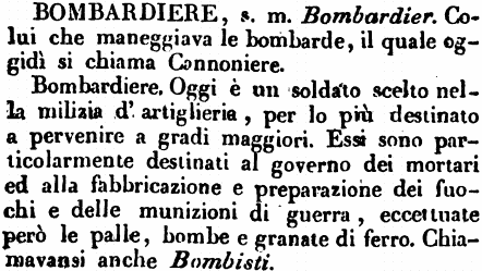 Bombardiere. Oggi è un sodato scelto nella milizia d'artiglieria, per lo più destinato a pervenire a gradi maggiori. Essi sono particolarmente destinati al governo dei mortari ed alla fabbricazione e preparazione dei fuochi e delle munizioni di guerra, eccettuate però le palle, bombe e granate di ferro. Chiamavansi anche Bombisti. [immagine] |