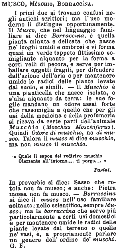 Musco, Muschio, Borraccina - I primi due si trovano confusi negli antichi scrittori; ma l'uso moderno li distingue opportunamente. Il Musco, che nel linguaggio familiare si dice Borraccina, è quella pianta minuta e delicata che nasce ne' luoghi umidi e ombrosi e vi forma quasi un verde tappeto fittissimo somigliante alquanto per la forma a corti velli di pecora, e serve per imballare oggetti fragili, per difendere dall'azione dell'aria e per mantenere umide le radici delle piante levate dal suolo, e simili. - Il Muschio è una pianticella che nasce isolata, e s'alza alquanto da terra: le sue foglie mandano un odore assai forte che rassomiglia a quello che per gli usi della medicina e della profumeria si ricava da certe parti dell'animale Muschio (Moschus Moschiferus). Quindi Odore di muschio, no di musco. Talora il musco si dice muschio, ma non musco il muschio.