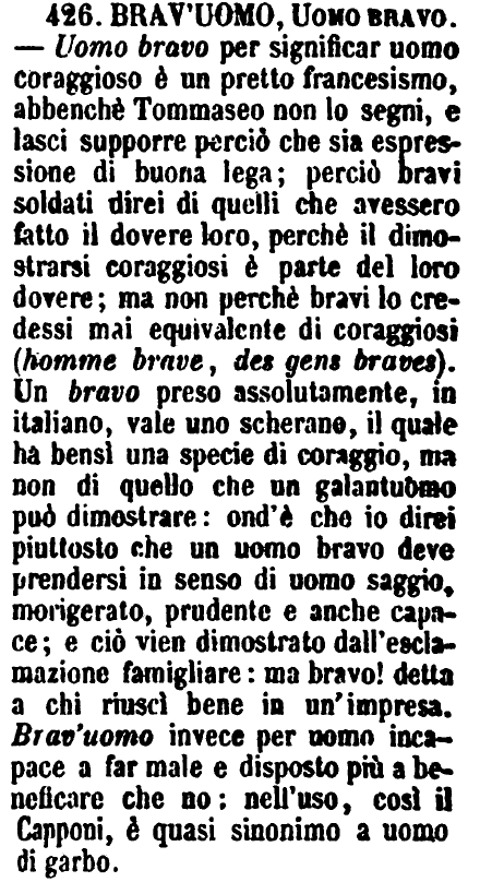Brav’uomo, Uomo bravo - Uomo bravo per significar uomo coraggioso è un pretto francesismo, abbenchè Tommaseo non lo segni, e lasci supporre perciò che sia espressione di buona lega; perciò bravi soldati direi di quelli che avessero fatto il dovere loro, perchè il dimostrarsi coraggiosi è parte del loro dovere; ma non perchè bravi lo credessi mai equivalente di coraggiosi (homme brave, des gens braves). Un bravo preso assolutamente, in italiano, vale uno scherano, il quale ha bensì una specie di coraggio, ma non di quello che un galantuomo può dimostrare: ond'è che io direi piuttosto che un uomo bravo deve prendersi in senso di uomo saggio, morigerato, prudente e anche capace; e ciò vien dimostrato dall'esclamazione famigliare: ma bravo! detta a chi riuscì bene in un'impresa. Brav'uomo invece per uomo incapace a far male e disposto più a beneficare che no: nell'uso, così il Capponi, è quasi sinonimo a uomo di garbo. [immagine]