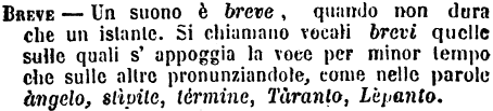 | Breve - Un suono è breve, quando non dura che un istante. Si chiamano vocali brevi quelle sulle quali s'appoggia la voce per minor tempo che sulle altre pronunziandole, come nelle parole àngelo, stìpite, términe, Tàranto, Lèpanto. [immagine] |