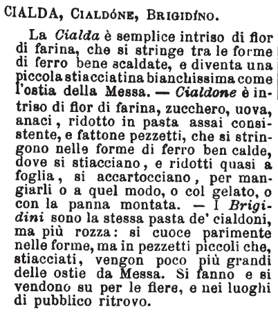 Cialda, Cialdone, Brigidino - La Cialda è semplice intriso di fior di farina, che si stringe tra le forme di ferro bene scaldate, e diventa una piccola stiacciatina bianchissima come l'ostia della Messa. - Cialdone è intriso di fior di farina, zucchero, uova, anaci, ridotto in pasta assai consistente, e fattone pezzetti, che si stringono nelle forme di ferro ben calde, dove si stiacciano, e ridotti quasi a foglia, si accartocciano, per mangiarli o a quel modo, o col gelato, o con la panna montata. - I Brigidini sono la stessa pasta de' cialdoni, ma più rozza: si cuoce parimente nelle forme, ma in pezzetti piccoli che, stiacciati, vengon poco più grandi delle ostie da Messa. Si fanno e si vendono su per le fiere, e nei luoghi di pubblico ritrovo. [immagine]