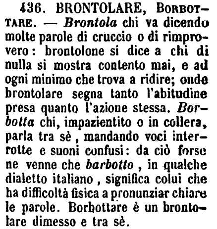 Borbottare, Brontolare, Bofonchiare, Taroccare - Borbottare è proprio di chi, a parole tronche e a voce più o meno sommessa, parla o da sè o non direttamente a questo ed a quello. - Il Brontolare è qualcosa più, e si fa generalmente per mostrare la disapprovazione o il cruccio. - «Non fa altro che brontolare, e nulla gli par fatto bene.» - Più ancora del Brontolare è il Bofonchiare, il quale spesso è accompagnato da parole irose. - Il Taroccare compie questo crescendo, perchè, oltre alle parole irose, è accompagnato da atti di impazienza, e anche da minacce. [immagine]