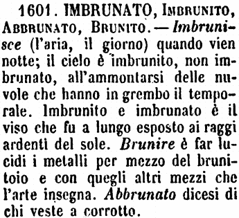 | Imbrunato, Imbrunito, Abbrunato, Brunito - Imbrunisce (l'aria, il giorno) quando vien notte; il cielo è imbrunito, non imbrunato, all'ammontarsi delle nuvole che hanno in grembo il temporale. Imbrunito e imbrunato è il viso che fu a lungo esposto ai raggi ardenti del sole. Brunire è far lucidi i metalli per mezzo del brunitoio e con quegli altri mezzi che l'arte insegna. Abbrunato dicesi di chi veste a corrotto. [immagine] |