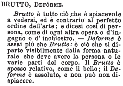 | Brutto, Deforme - Brutto è tutto ciò che è spiacevole a vedersi, ed è contrario al perfetto ordine dell'arte; e dicesi così di persona, come di ogni altra opera o d'ingegno o d'inchiostro. - Deforme è assai più che Brutto: è ciò che si diparte visibilmente dalla forma naturale che deve avere la persona o le varie parti del corpo. il Brutto è spesso relativo, come il bello; il Deforme è assoluto, e non può non dispiacere. [immagine] |