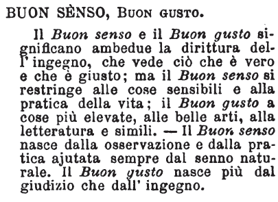 | Buon senso, Buon gusto - Il Buon senso e il Buon gusto significano ambedue la dirittura dell'ingegno, che vede ciò che è vero e che è giusto; ma il Buon senso si restringe alle cose sensibili e alla pratica della vita; il Buon gusto a cose più elevate, alle belle arti, alla letteratura e simili. - Il Buon senso nasce dalla osservazione e dalla pratica ajutata sempre dal senno naturale. Il Buon gusto nasce più dal giudizio che dall'ingegno. [immagine] |