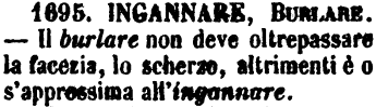 | Burlare, Scherzare, Ingannare - «Lo scherzo è più innocente talvolta, e più amichevole. Si fa una burla anco a gente non nota od estrania, per trastullare sè e la brigata». A.