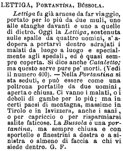| Lettiga, Portantina, Bussola - Lettiga fu già arnese da far viaggio, portato per lo più da due muli, uno alle stanghe davanti e uno a quelle di dietro. Oggi la Lettiga, sostenuta sulle spalle da quattro uomini, s'adopera a portarvi dentro sdrajati i malati da luogo a luogo e specialmente agli spedali, ed è quasi sempre coperta. Si dice anche Cataletto; ma questo serve pure pe' morti. (Vedi il numero 400). - Nella Portantina si sta seduti, e può essere come una poltrona portatile da due uomini, aperta o chiusa. Ci vanno i malati, o i deboli di gambe per lo più; ma in certi paesi di montagna, massime in Tirolo e in Isvizzera, anche i sani, o per capriccio o per risparmiarsi salite faticose. La Bussola è una portantina, ma sempre chiusa e con sportello e finestrini a destra e a sinistra o almeno di faccia a chi vi siede dentro. G. F. [immagine] |