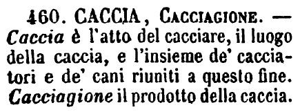 | Caccia, Cacciagione - Caccia è l'atto del cacciare, il luogo della caccia, e l'insieme de' cacciatori e de' cani riuniti a questo fine. Cacciagione il prodotto della caccia. [immagine] |