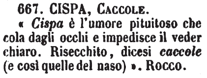 Cispa, Caccole - « Cispa è l'umore pituitoso che cola dagli occhi e impedisce il veder chiaro. Risecchito, dicesi caccole (e così quelle del naso) ». Rocco. [immagine]