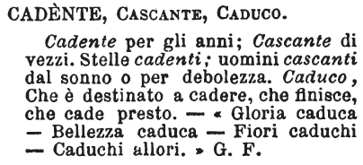 | Cadente, Cascante, Caduco - Cadente per gli anni; Cascante di vezzi. Stelle cadenti; uomini cascanti dal sonno o per debolezza. Caduco, Che è destinto a cadere, che finisce, che cade presto. - « Gloria caduca - Bellezza caduca - Fiori caduchi - Caduchi allori. » G. F. [immagine] |
