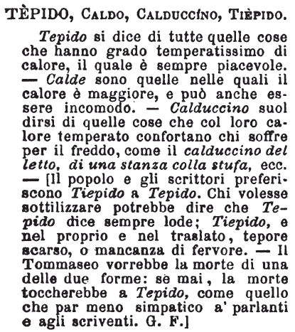 | Tepido, Caldo, Calduccino, Tiepido - Tepido si dice di tutte quelle cose che hanno grado temperatissimo di calore, il quale è sempre piacevole. - Calde sono quelle nelle quali il calore è maggiore, e può anche essere incomodo. - Calduccino suol dirsi di quelle cose che col loro calore temperato confortano chi soffre per il freddo, come il calduccino del letto, di una stanza colla stufa, ecc. - [Il popolo e gli scrittori preferiscono Tiepido a Tepido. Chi volesse sottilizzare potrebbe dire che Tepido dice sempre lode; Tiepido, e nel proprio e nel traslato, tepore scarso, o mancanza di fervore. - Il Tommaseo vorrebbe la morte di una delle due forme: se mai, la morte toccherebbe a Tepido, come quello che par meno simpatico a' parlanti e agli scriventi. G. F.] [immagine] |