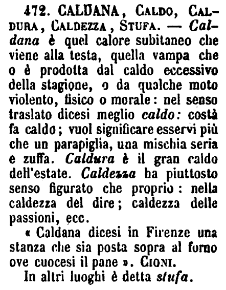 | Caldana, Caldo, Caldura, Caldezza, Stufa - Caldana è quel calore subitaneo che viene alla testa, quella vampa che o è prodotta dal caldo eccessivo della stagione, o da qualche moto violento, fisico o morale: nel senso traslato dicesi meglio caldo: costà fa caldo; vuol significare esservi più che un parapiglia, una mischia seria e zuffa. Caldura è il gran caldo dell'estate. Caldezza ha piuttosto senso figurato che proprio: nella caldezza del dire; caldezza delle passioni, ecc.