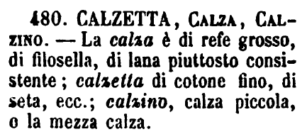 | Calzetta, Calza, Calzino - La calza è di refe grosso, di filosella, di lana piuttosto consistente; calzetta di cotone fino, di seta, ecc.; calzino, calza piccola, o la mezza calza. [immagine] |