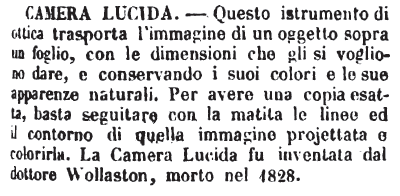 | Camera lucida - Questo istrumento di ottica trasporta l'immagine di un oggetto sopra un foglio, con le dimensioni che si vogliono dare, e conservando i suoi colori e le sue apparenze naturali. Per avere una copia esatta, basta seguitare con la matita le linee ed il contorno di quella immagine projettata e colorirla. La Camera Lucida fu inventata dal dottore Wollaston, morto nel 1828. [immagine] |