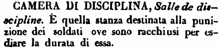 | Camera di disciplina - Salle de disscipline. È quella stanza destinata alla punizione dei soldati ove sono racchiusi per espiare la durata di essa. [immagine] |