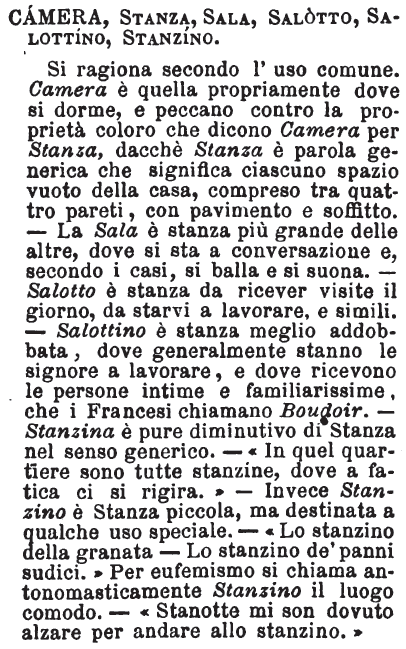 La parola stanza, per significare quella ove si dorme, cioè la camera, ha bisogno del complemento da letto. Quelle dei bastimenti sono camere, camerette e anche camerini: anche quella grande del capitano, o di convegno de' passeggieri, è detta camera. Gabinetto è piccola stanzuccia appartata e adattata a studio. I gabinetti di fisica, letterarii ecc. possono constare di una o più stanze anche grandissime. Nel linguaggio politico gabinetto vale il ministero: i pretesi segreti de' gabinetti fanno sudare molte fiate invano i politicastri da caffè. Cameretta è diminutivo di camera. Camerino è pure diminutivo, ma ha significati proprii: così dicesi il luogo ov'è il cesso: camerino è pure detta quella stanzuccia ove ne' teatri gli attori si vestono e svestono. Cella è la cameruccia povera d'arredi del romito, del religioso. «Camerella è, nella lingua viva, quel chiuso di drappi o simili robe che si fa intorno al letto; che non è però da confondere con lo zanzariere, nè col letto parato». Tommaseo. [immagine] |