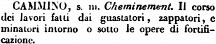 | Cammino - s. m. Cheminement. Il corso dei lavori fatti dai guastatori, zappatori, e minatori intorno o sotto le opere di fortificazione. [immagine] |