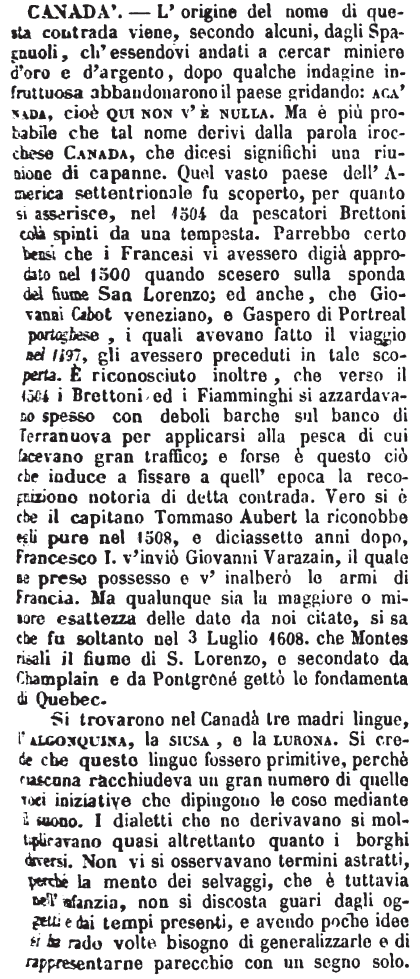 | Canadà - L'origine del nome di questa contrada viene, secondo alcuni, dagli Spagnuoli, ch'essendovi andati a cercar miniere d'oro e d'argento, dopo qualche indagine infruttuosa abbandonarono il paese gridando: aca' nada, cioè qui non v'è nulla. Ma è più probabile che tal nome derivi dalla parola irocchese Canada, che dicesi significhi una riunione di capanne. Quel vasto paese dell'America settentrionale fu scoperto, per quanto si asserisce, nel 1504 da pescatori Brettoni colà spinti da una tempesta. Parrebbe certo bensì che i Francesi vi avessero digià approdato nel 1500 quando scesero sulla sponda del fiume San Lorenzo; ed anche, che Giovanni Cabot veneziano, e Gaspero di Portreal portoghese, i quali avevano fatto il viaggio nel 1497, gli avessero preceduti in tale scoperta. E' riconosciuto inoltre, che verso il 1504 i Brettoni ed i Fiamminghi si azzardavano spesso con deboli barche sul banco di Terranuova per applicarsi alla pesca di cui facevano gran traffico; e forse è questo ciò che induce a fissare a quell'epoca la recognizione notoria di detta contrada. Vero si è che il capitano Tommaso Aubert la riconobbe egli pure nel 1508, e diciassette anni dopo, Francesco I. v'inviò Giovanni Varazain, il quale ne prese possesso e v'inalberò le armi di Francia. Ma qualunque sia la maggiore o minore esattezza delle date da noi citate, si sa che fu soltanto nel 3 luglio 1608. che Montes risalì il fiume di S. Lorenzo, e secondato da Champlain e da Pontgrené gettò le fondamenta di Quebec.