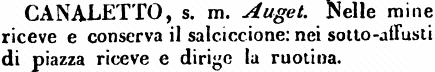| Canaletto - s. m. Auget. Nelle mine riceve e conserva il salciccione: nei sotto-affusti di piazza riceve e dirige la ruotina. [immagine] |