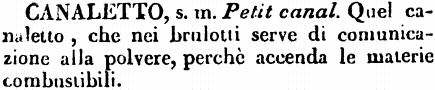 | Canaletto - s. m. Petit canal. Quel canaletto, che nei brulotti serve di comunicazione alla polvere, perchè accenda le materie combustibili. [immagine] |